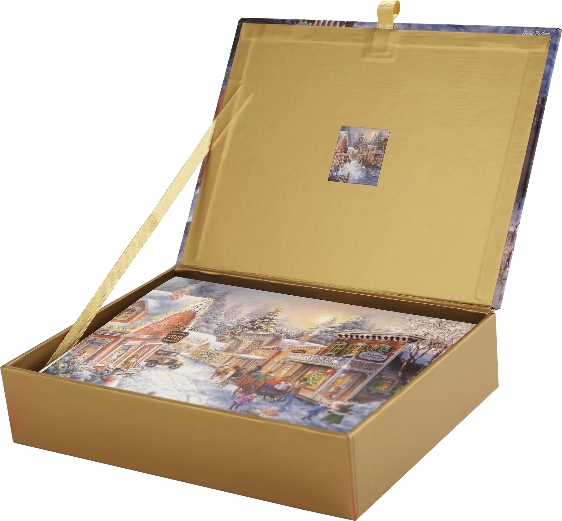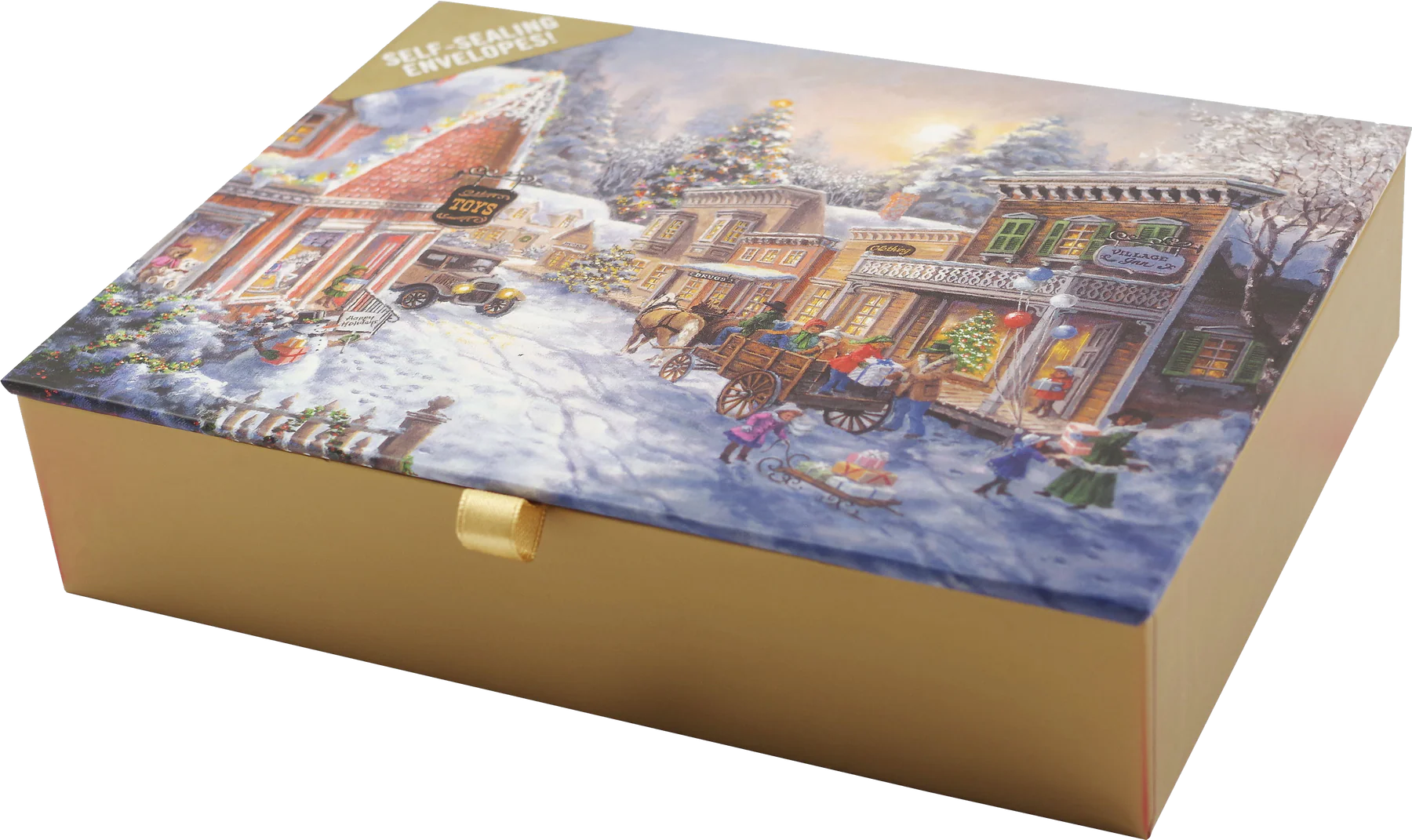 Seasonal activities are in full swing in this merry country village, aglow for the holidays. Gold foil accents illuminate the nostalgic scene.