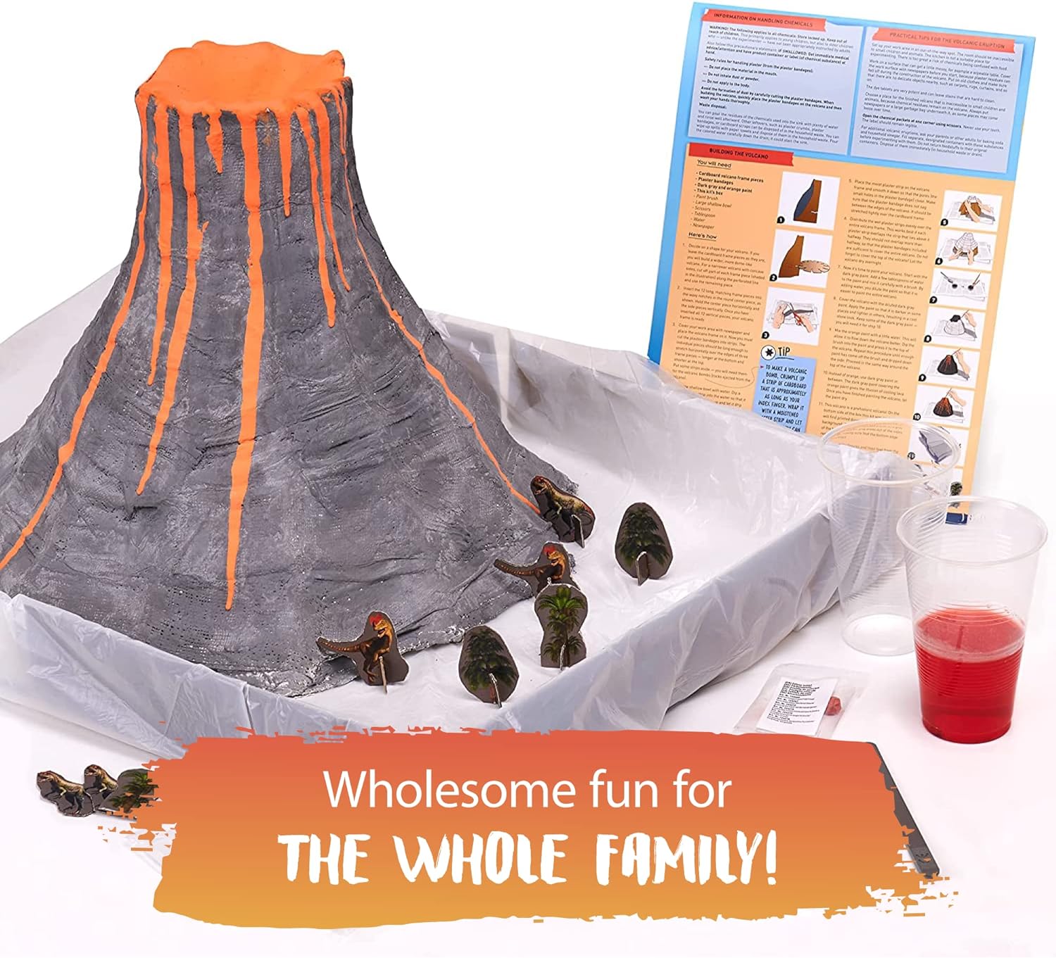 Simulate the epic, earth-shattering power of a volcano in your own home! Build a huge volcano model with a sturdy frame that effortlessly slides together. Wrap the frame in hardening plaster-coated fabric strips and then paint it to look like the real thing. Then, bring your volcano to life with cutouts of dinosaurs and prehistoric trees — this isn’t just any old volcano; this is a model of an extremely ancient and immensely large volcano from the days dinosaurs roamed the planet! When you’re ready for action, simply mix the two non-hazardous powders, dye, and water to create a chemical reaction of flowing red ooze that simulates the molten hot lava flows of a real volcanic eruption. Six packets of chemicals are included, allowing the volcano to be erupted multiple times. The volcano frame enables you to choose between two volcano shapes, with the final model measuring more than one foot tall. A large, full-color scientific poster of a volcano with illustrated instructions and lots of educational information about volcanoes is included. By studying these awe-inspiring and cataclysmic natural phenomena, you can learn more about the inner workings of Earth, learn about the different types of volcanoes and what causes them, and explore volcanoes around the world and how they have affected life on Earth for eons. Get ready to journey back in time and deep beneath Earth’s surface with this fun, hands-on craft project and fascinating science lesson! + Build a giant volcano model from cardboard and plaster; choose from two types of volcanoes. + Decorate with paint, fake boulders, and cardboard cutouts of dinosaurs and prehistoric plants. + Use safe chemical reactions to trigger volcanic eruptions and watch the lava bubble and flow. + Learn all about real-life volcanoes and what causes them. + Includes a full-color volcano poster and instruction sheet