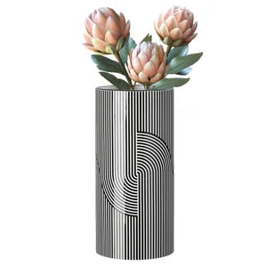 Make a bold statement with this black and white modern cylinder vase, featuring a unique geometric-inspired pattern. Its large size makes it perfect for showcasing stunning, oversized bouquets. The sleek design and striking contrast add contemporary flair to any room or occasion.